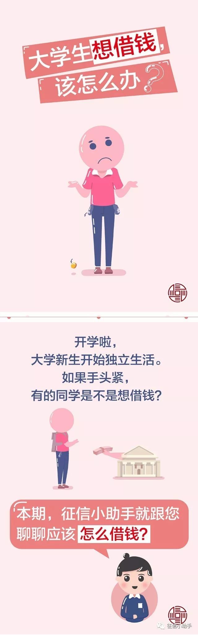 开学啦,很多同学已迈入大学校门开始独立生活。有的同学可能会手头紧张需要借钱。本期征信小助手就跟您聊聊应怎么借钱。