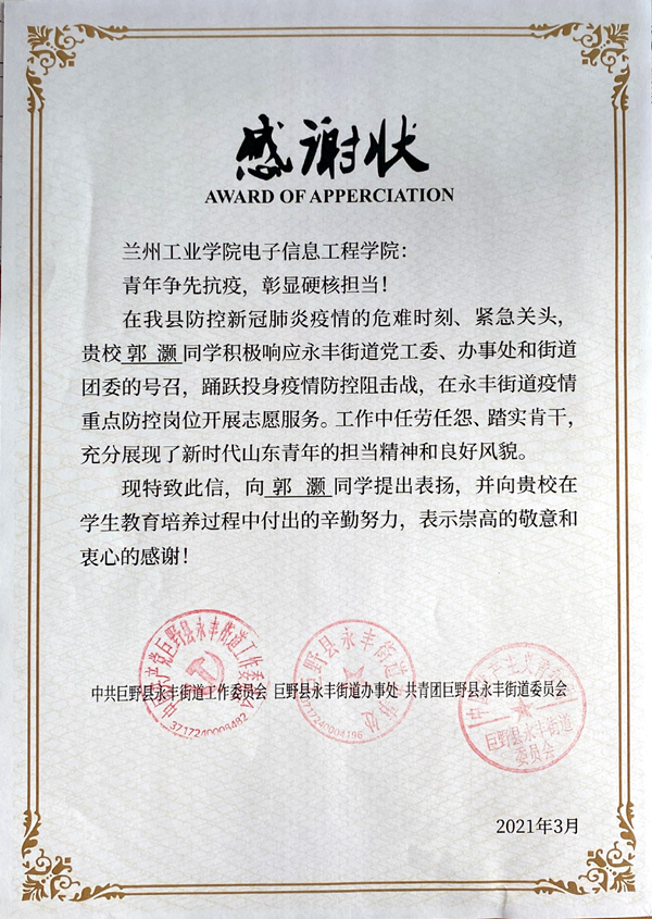 近日,我院收到来自山东省巨野县永丰街道党工委、办事处和街道团委的感谢状,对18级通信工程2班郭灏同学能积极投身家乡疫情防控志愿服务的行为表示肯定和感谢。