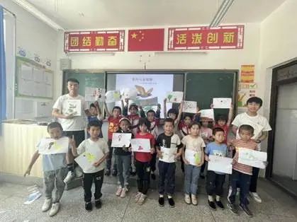 7 月 7 日上午,实践团队成员带着各种类型的绘本来到左家小学,首先给同学们发放了绘本,孩子们争先恐后的阅读了所有的绘本,感受书籍带来的快乐,随后实践团成员在低年级学生中开展数学类绘本《时钟大冒险》、情商类绘本《科蒂有个金翅膀》、环保类绘本《假如地球被我们吃掉了》的阅读活动,给一年级学生指导创新手工、看图说话写作;指导二年级学生书写阅读笔记,绘本中精美生动的画面和简练易懂的语言给孩子提供丰富想象空间,孩子不由自主融入到绘本中里,对书中的内容进行预测、提问、想象并迁移到日常生活中,培养孩子们的阅读力、思辨力、想象力、创作力。