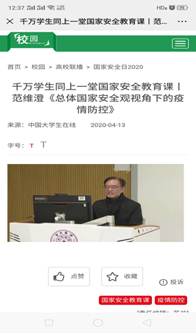 按照学校安排,公寓管理服务中心2020年4月15日,组织全体职工在线学习《关于开展全省教育系统国家安全教育日宣传教育活动的通知》精神,学习了政治安全、国土安全、军事安全、经济安全、文化安全、社会安全、科技安全、信息安全、生态安全、资源安全、核安全、生物安全等于一体的国家安全体系;并组织职工在线观看由清华大学公共安全研究院范维澄教授主讲的:千万学生同上一堂国家安全教育课《总体国家安全观视角下的疫情防控》。