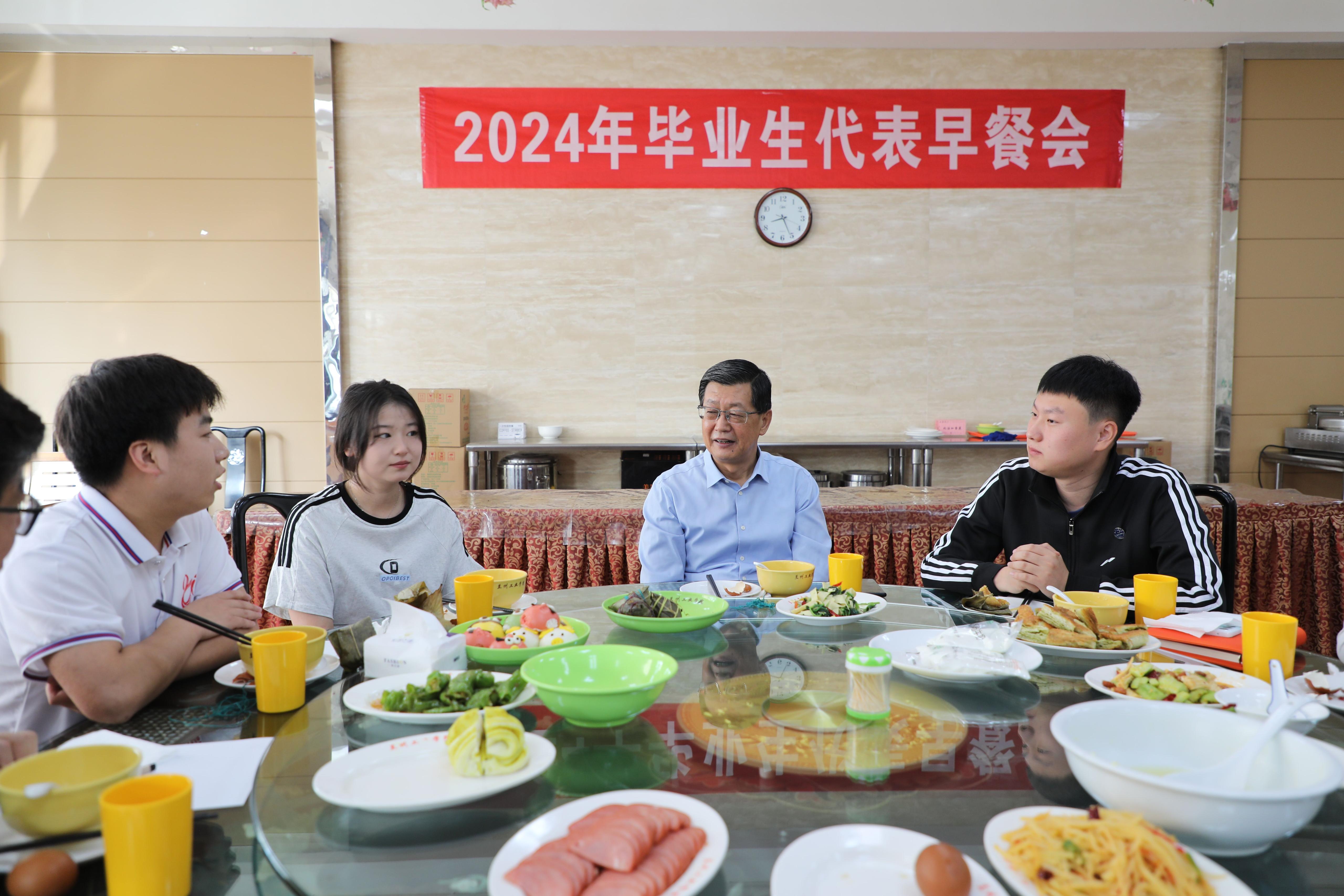 早餐会上,校领导关切地询问同学们的就业去向、未来打算,和同学们一起回忆大学生活的点点滴滴,表达离别之际的依依不舍和美好祝愿。毕业生代表立足学校长远建设与发展,结合自身大学学习生活感受,各抒己见、畅所欲言,从新校区搬迁、硕士学位授权单位建设、学科发展、毕业生就业能力提升、校园文化活动以及学生公寓和食堂管理服务等多个方面,提出了许多良好的意见和建议。