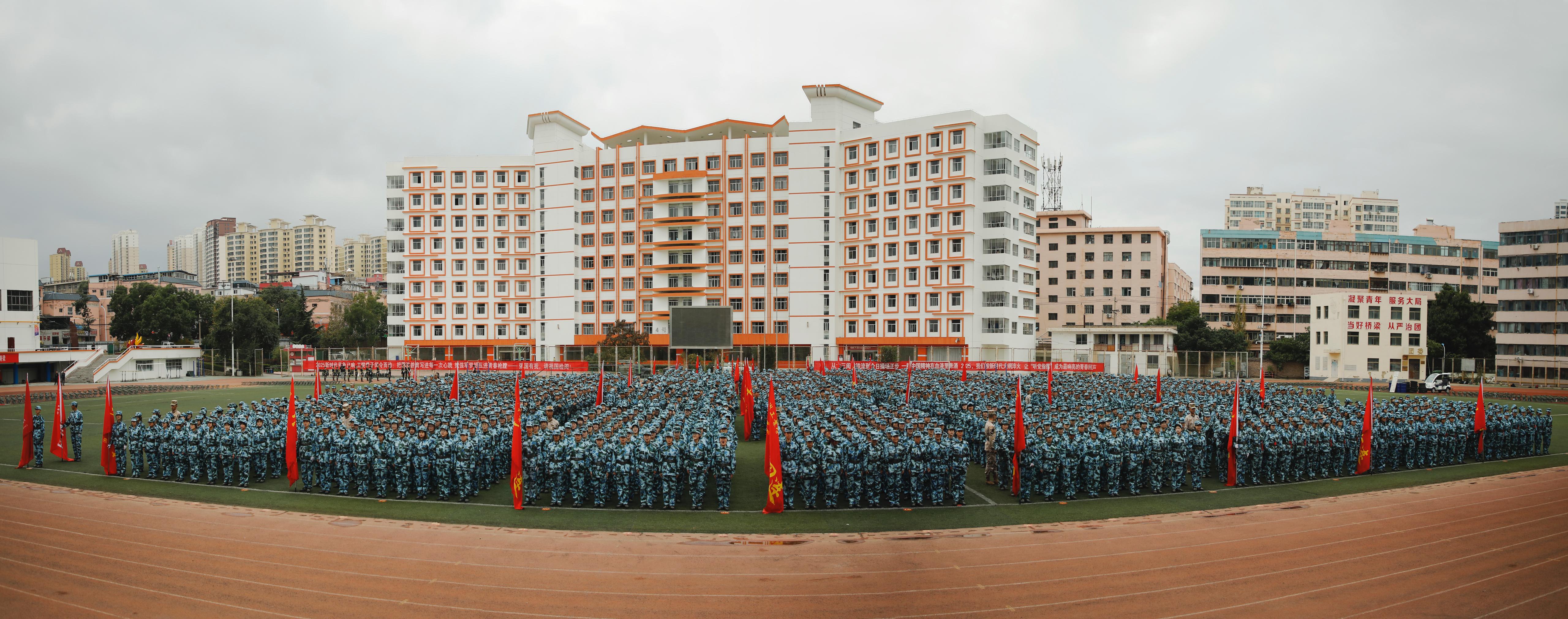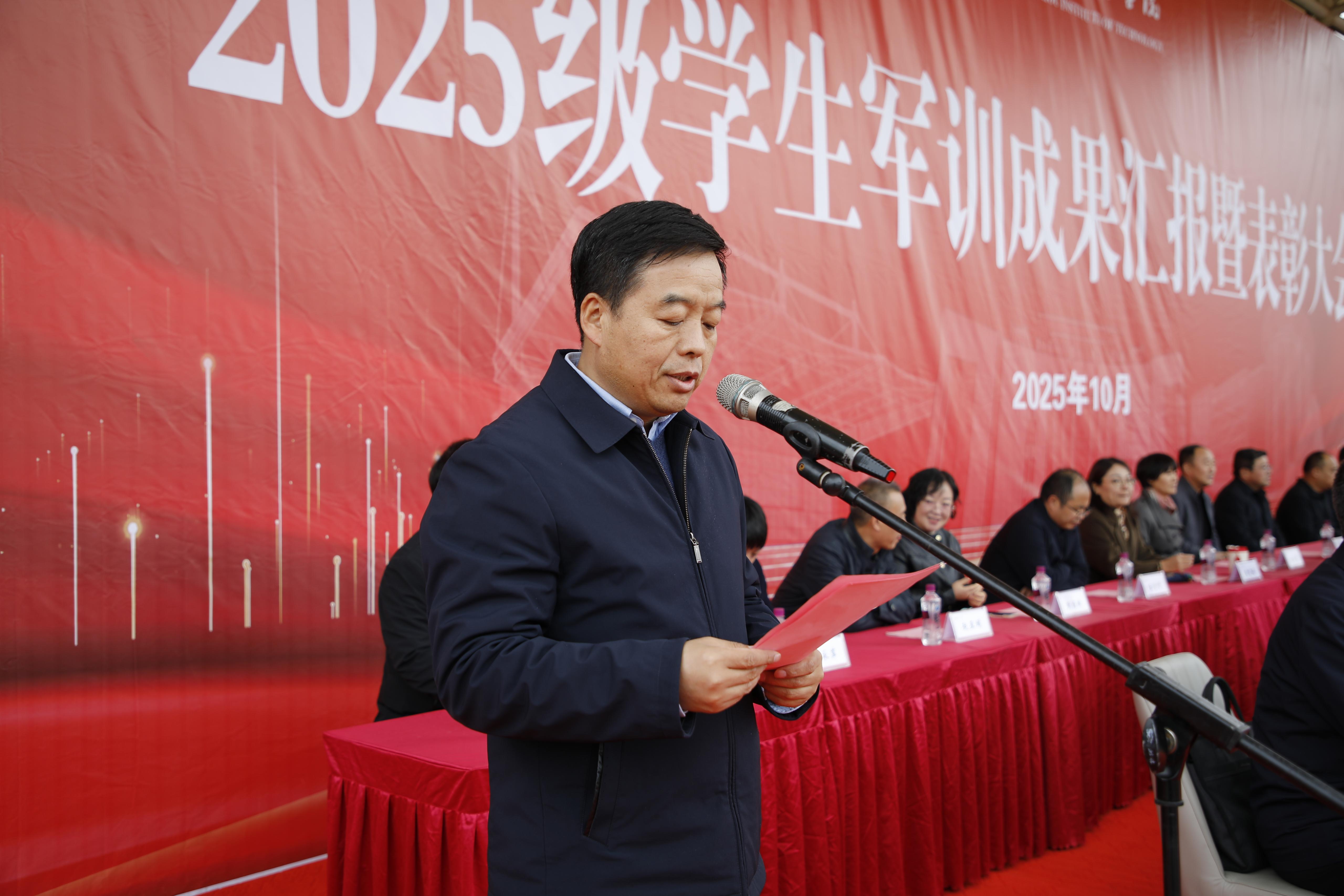 刘新辉发表讲话。他充分肯定了同学们在军训中的优异表现,并代表学校向顺利完成军训的全体新生表示祝贺,向承训部队及教官和参与军训工作的教职员工致以衷心感谢。刘新辉向即将正式开启大学生涯的全体学生提出希望,一是将军训中培养的坚韧意志转化为勤奋学习的持久动力,以“咬定青山不放松”的韧劲钻研专业、提升素质。二是将严守纪律的作风融入日常行为,自觉遵守校纪校规,共建文明有序的校园环境。三是将团结协作的精神投入集体生活,珍惜荣誉、互助成长,增强集体凝聚力。四是将爱国报国的情怀升华为奋斗志向,把个人理想融入国家发展大局,努力成长为德智体美劳全面发展的社会主义建设者和接班人。