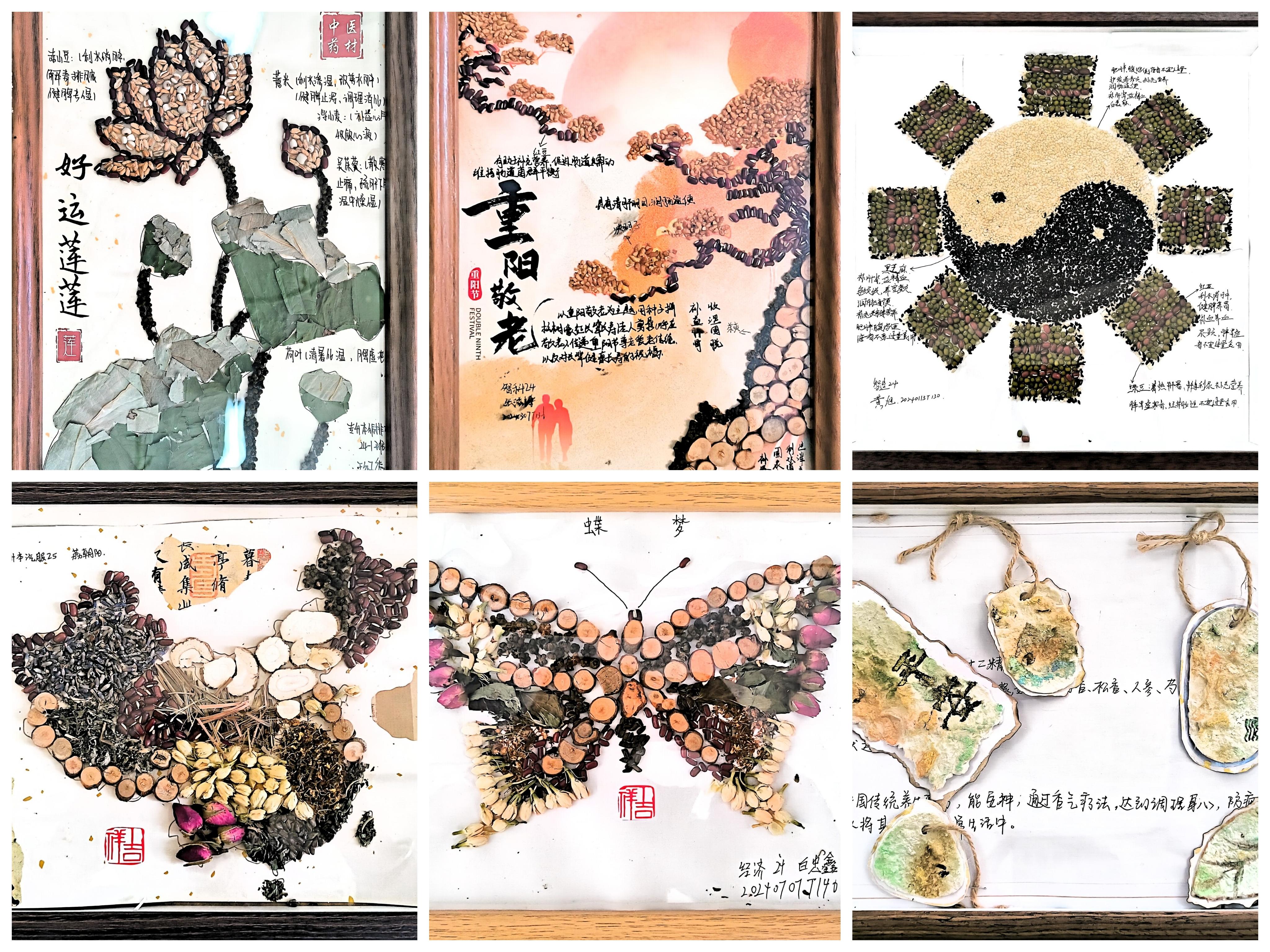 课程以沉浸式、互动式学习为特色,融合“翻转课堂”教学理念与中医药文化实践,组织学生开展八段锦习练、中药养生茶调制、创意作品设计等多元体验,引导学生在动手中感悟、在体验中创新,实现了知识传授、能力培养与文化浸润的有机统一。结课阶段,同学们呈现了一系列设计精美、构思新颖的作品,充分展现了课程的育人成效与学生的综合素养。