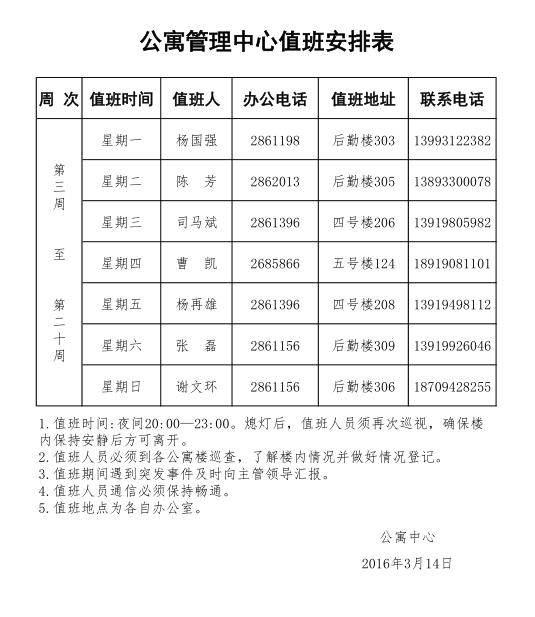 公寓管理中心值班安排表