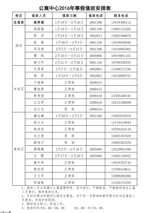 学校定于2016年1月18日—2月27日放寒假。寒假期间,为了确保公寓中心各项工作顺利进行,同时也让大家过一个愉快的假期和祥和的节日,现将寒假期间相关事宜通知如下: